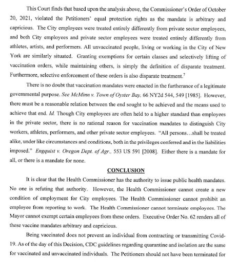 NY State Supreme Court reinstates all fired unvaccinated employees, orders backpay, says the state violated rights, acted arbitrary & capricious, notes:“Being vaccinated does not prevent an individual from contracting or transmitting Covid-19.”