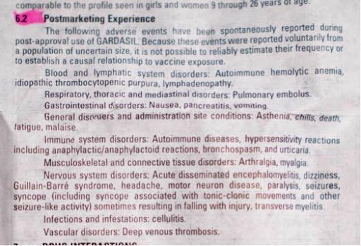 “After the original Gardasil vaccine was licensed for 11-12 year old girls and young women, thousands of adverse reaction reports were filed for: sudden collapse with unconsciousness within 24 hours, seizures, muscle pain and weakness, disabling fatigue, Guillain-Barre Syndrome (GBS), facial paralysis brain inflammation, rheumatoid arthritis, lupus, blood clots, premature ovarian failure, optic neuritis, multiple sclerosis, strokes, heart and other serious health problems, including death. Similar reports have been filed for the Gardasil-9 vaccine…”